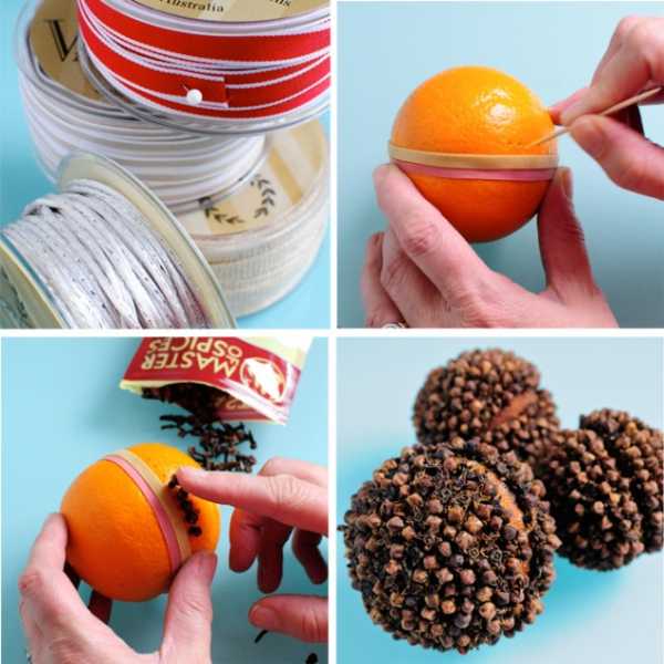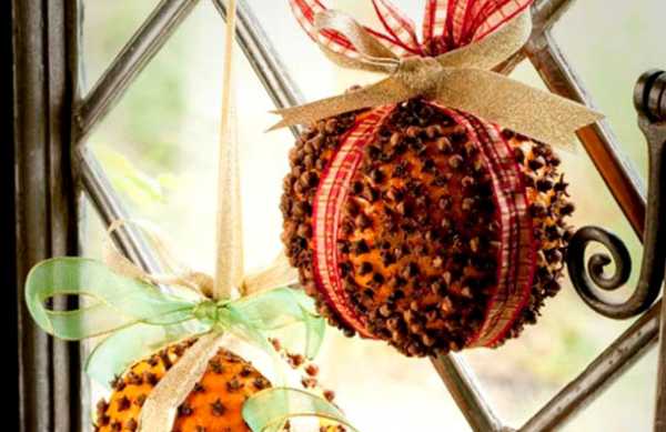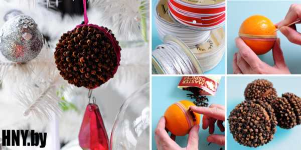 Новый год – это праздник запахов! Почему бы не добавить немного аромата к новогодней елке? Для изготовления такого шара Вам понадобится: апельсин, лимон или любой другой цитрусовый фрукт, ленты, широкая резинка, зубочистка, новогодние специи (корица, гвоздика и прочее).