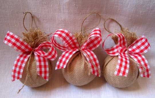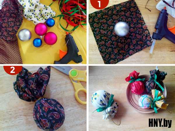 Старые елочные шары можно обновить, завернув каждый из них в лоскуток красивой ткани и перевязав ленточкой.