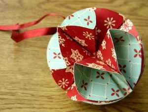 Ну и последний вариант новогоднего шара, сделанного своими руками, станет шар из бумаги. Для него Вам понадобится: двусторонняя плотная бумага, ножницы, клей, ленточка.