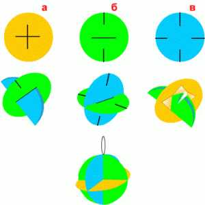 Вырежьте из цветного картона или плотной бумаги три круга одинакового размера, но разного цвета. В первом из них прорежьте крест (рис. а), во втором круге сделайте горизонтальный надрез посередине и перпендикулярно к нему два надреза в направлении от окружности к центру круга (рис. б), а в третьем — четыре надреза в виде креста, также по направлению от окружности к центру (рис. в). Круг «в» проденьте в круг «б». В круге «а» отогните уголки, образовавшиеся в результате его надреза; получится квадратное отверстие. В него проденьте круги «б» и «в», предварительно сложив их. Затем уголки снова разогните (рис. г). Приделайте к получившемуся шарику ниточку.