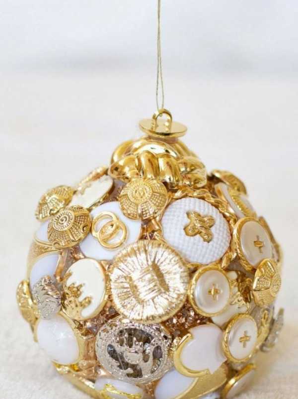 Изготовить новогодний шар из пуговиц смогут даже самые маленькие жильцы дома. Для такой поделки Вам понадобится: пенопластовый шар, разноцветные пуговицы, клей, нитка.