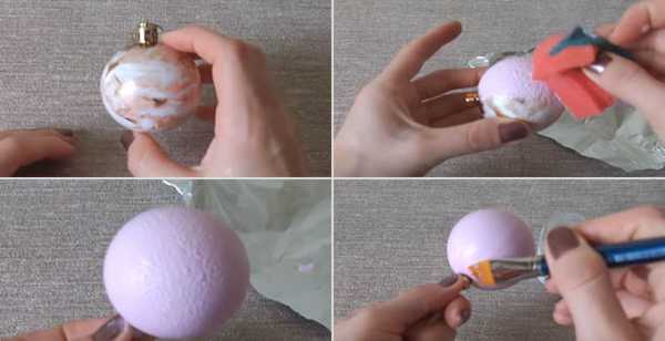 - Берём любой новогодний шарик, окрашиваем его с помощью акриловой художественной краски и губки в розовый цвет, даём просохнуть. Затем закрепляем краску акриловым лаком. Наносим его тонким слоем с помощью кисточки.