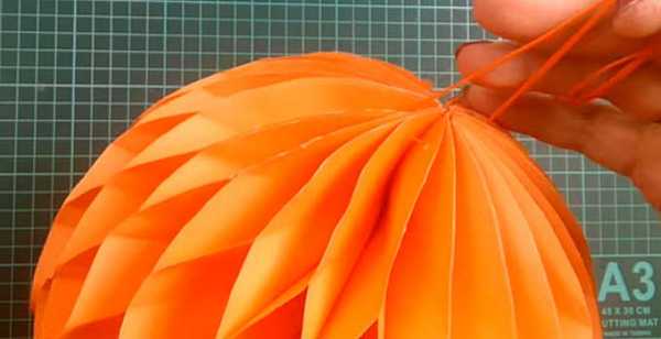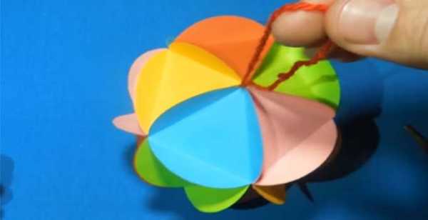 4. Прежде чем окончательно заклеить новогодний шарик, проденьте через него толстую нитку или ленточку. Также можно сделать замечательную елочную гирлянду из большого количества бумажных шариков.