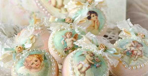 Приклеивать картинки нужно аккуратно, сверху проглаживая изображение кистью с клеем, чтобы бумага намокла и прижалась к игрушке. После высыхания можно дополнительно декорировать безделушку с помощью акриловой краски или блесток. В конце обработать всю поверхность лаком, что закрепит слои и придаст блеск.