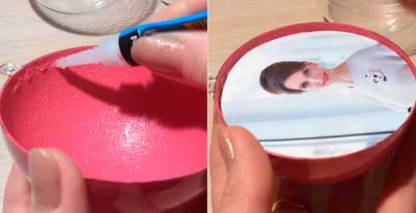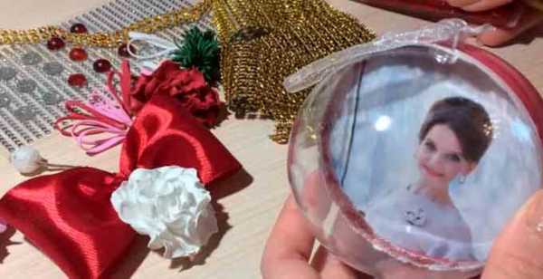 Лучше выбирать маленькие картинки, а наклеивать их в технике аппликации, то есть набирать узор постепенно кусочками. Фото близких отлично будет смотреться на боку изделия, такая вещица для елки может стать эксклюзивным подарком.