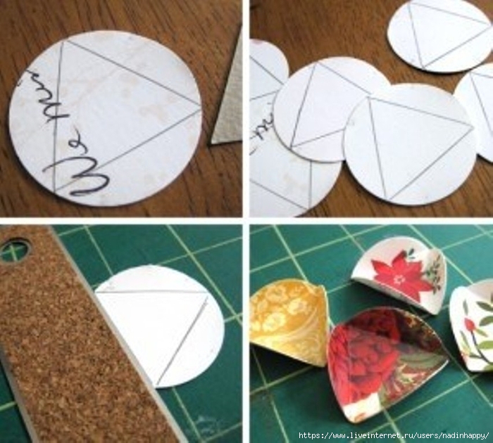 Необходимо сделать шаблон из бумаги или толстого картона по размеру шара, чертим на бумаге круг, затем вырезаем шар, а после разрезаем шар на две равные части. Эти части послужат нам шаблоном, а позже станут деталью нашей поделки.