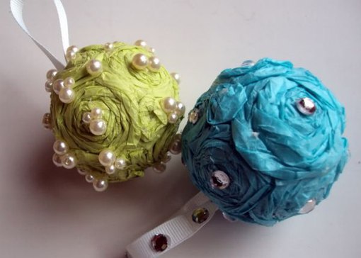 Такие поделки отлично украсят интерьер любого помещения, их можно вешать на окошки, на люстру, к потолку: в любом месте такие шарики поднимают праздничное настроение.