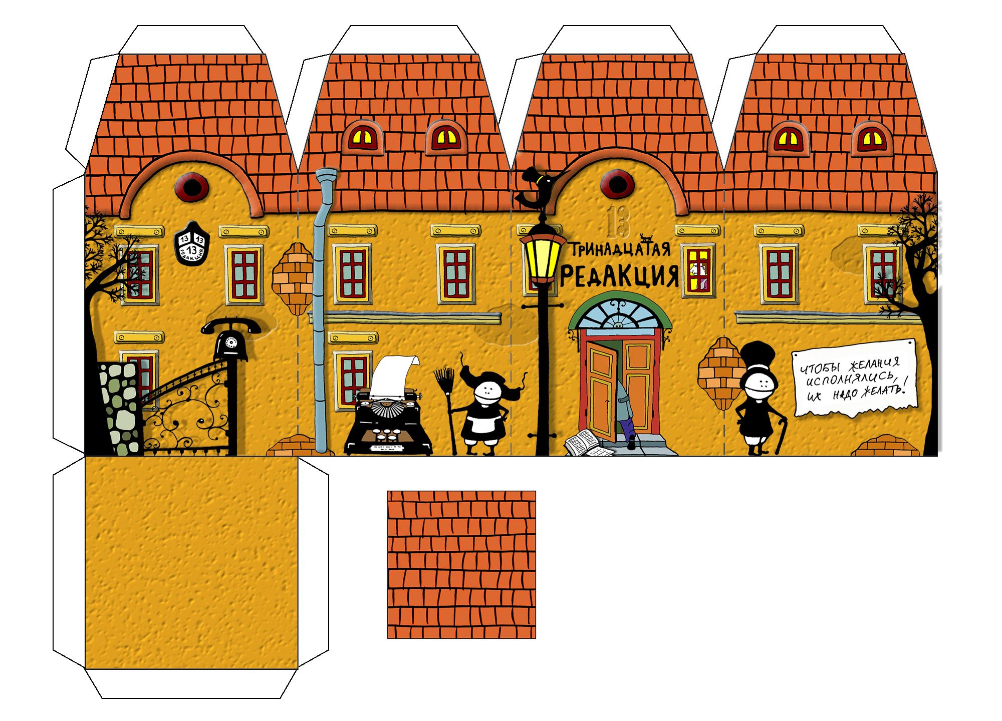 Поверхность стен оклеивается «обоями», т. е. раскрашенными полосками бумаги. Пол необходимо покрасить в коричневый цвет или застелить его линолеумом — его можно изготовить из клеенки.