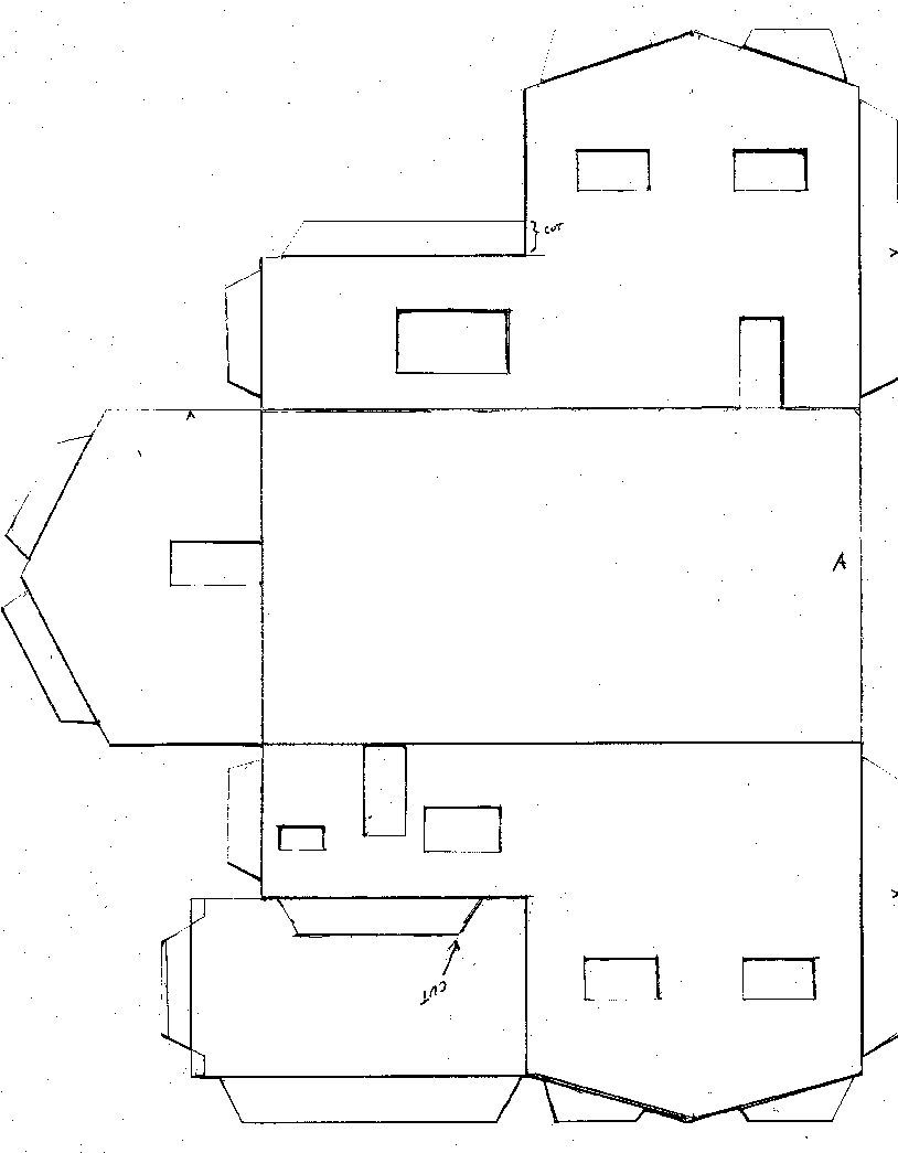 - Вырезаем окна как показано на схеме и приклеиваем один домик к другому.Надеемся, вашей кошечке понравится ее новый дом.