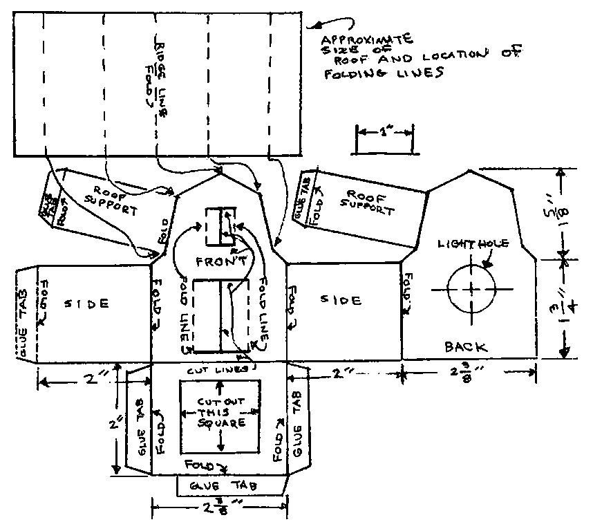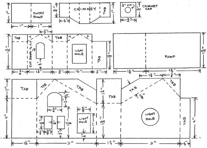На следующем этапе необходимо прочертить все «крылышки», которые вы видите на схеме. Они будут играть роль монтажных кронштейнов при сборке макета, поддерживать крышу и соединять стены. Далее следует самая ответственная часть работы, требующая аккуратности и внимания. Пройдите по всем линиям чертежа шариковой ручкой по линейке и с нажимом. Это делается для того, чтобы можно было сгибать бумагу в нужном месте.