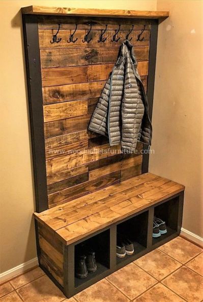 1. Простая полка для обуви в прихожей сделана из трех ящиков закрепленных на двух досках.