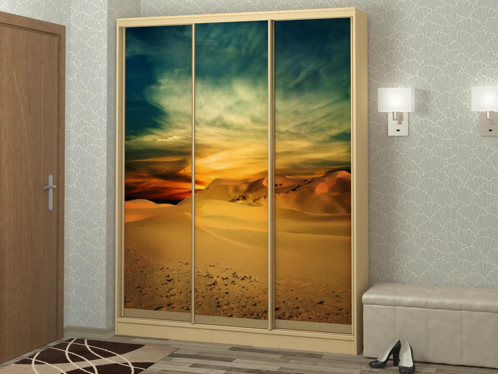 Популярной новинкой в дизайне шкафа-купе стало нанесение реалистичного изображения на фасады раздвижной конструкции: ночной город, пейзажи, натюрморты, морские просторы, городские пространства.