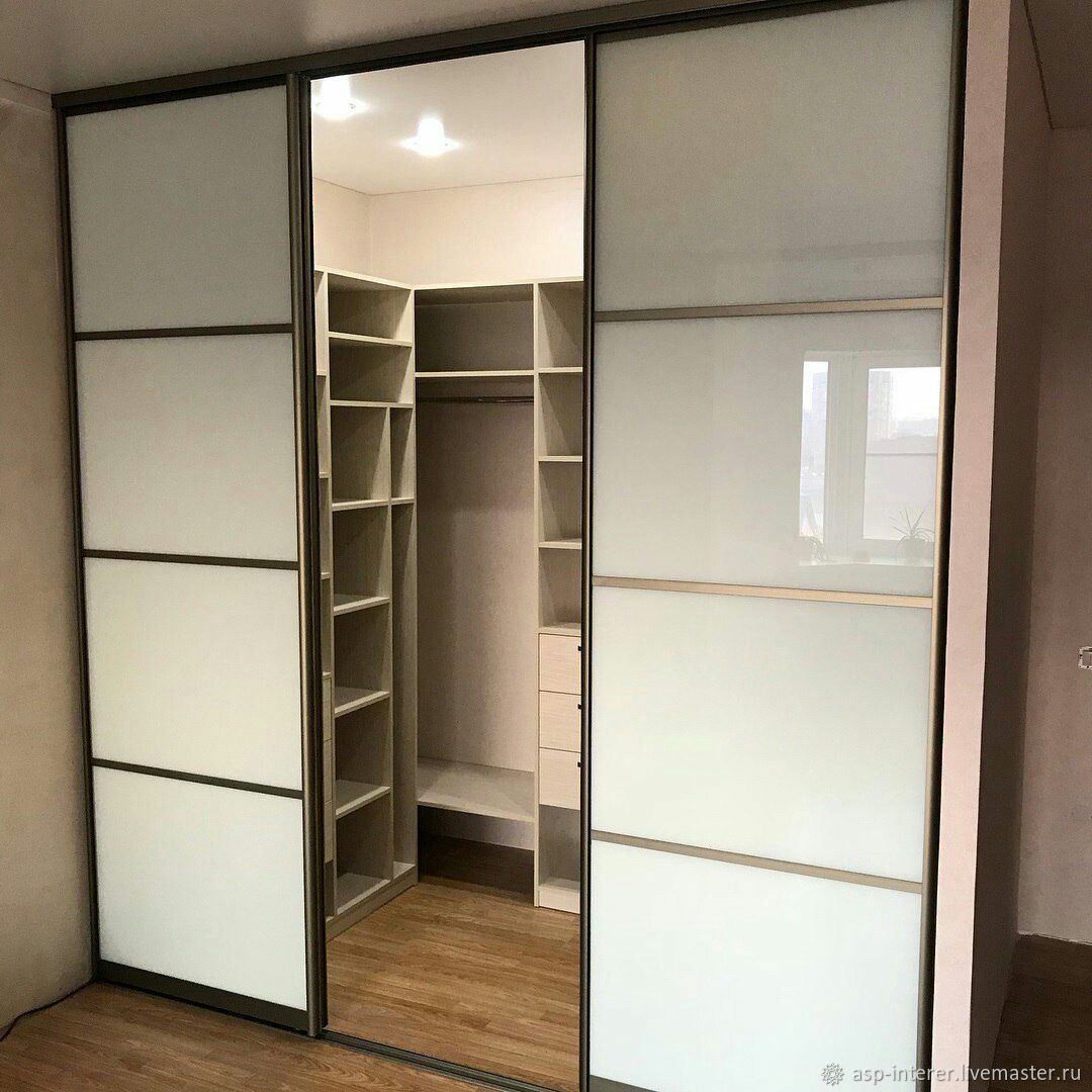 Г-образные представляют собой два прямых шкафа, объединенных вместе. Модель от Mr. Doors, представленная ниже, также дополнена стеллажом с открытыми полками, который одновременно служит разделителем для комнаты. Такое решение прекрасно подойдет для оформления квартиры-студии.