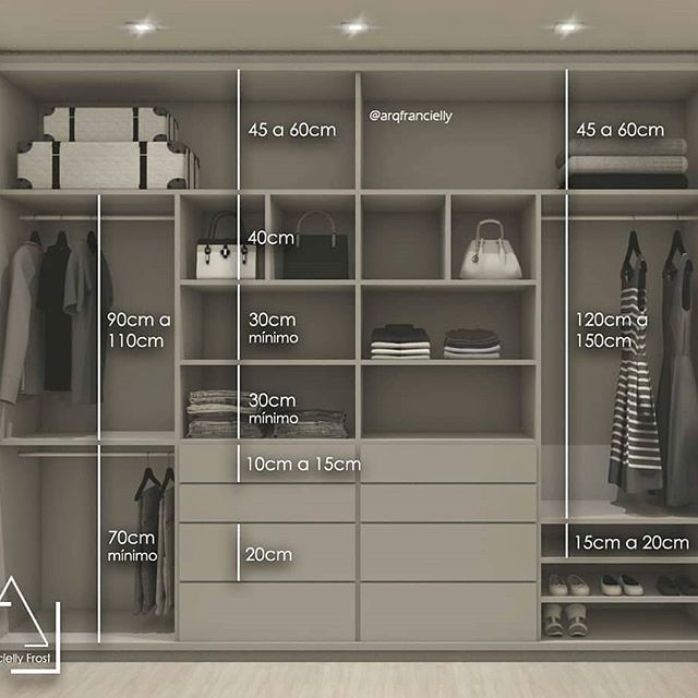 Глубина распашного шкафа должна составлять не меньше 60-65 см, раздвижного — на 10 см больше. Дальше определим высоты отделений: