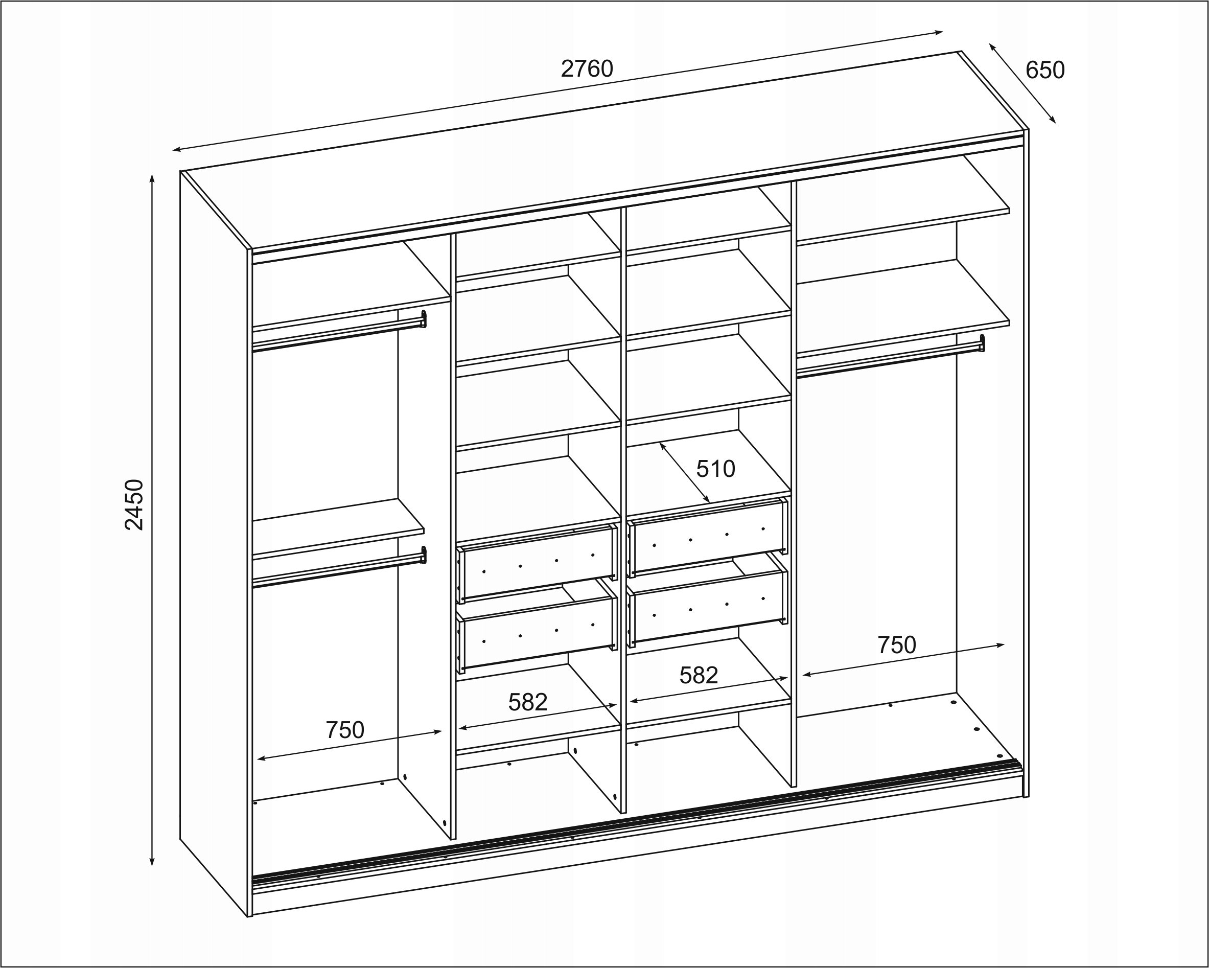 Шкаф-купе с 4 ящиками. Особенности: подвесной стержень, ящики и полки.