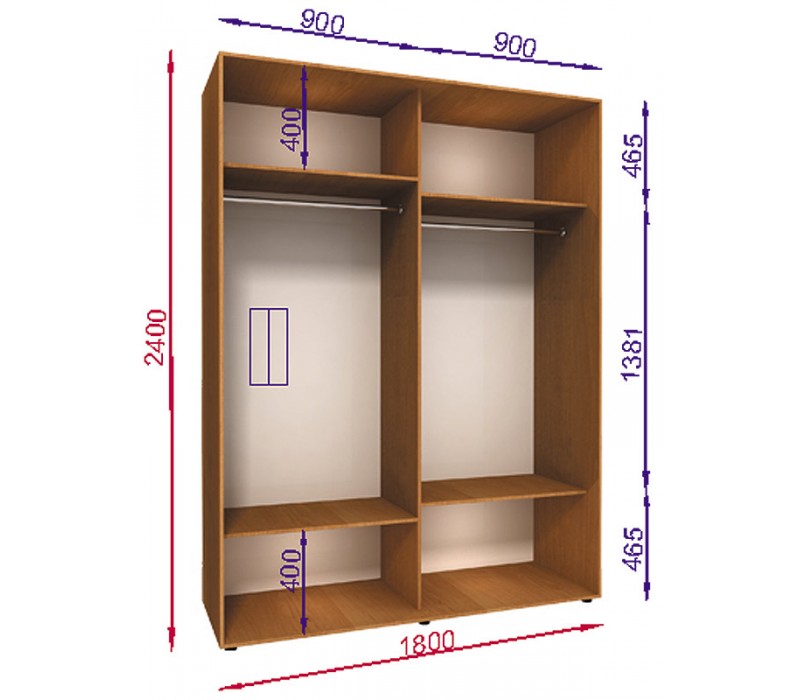 Пространство внутри шкафа-купе может быть поделено на две части, если вам необходимо место хранения вещей для двоих. Это может быть мужская и женская половины или отделения для двоих детей. Идеальным для хранения вертикальных вещей и длинной верхней одежды считается пространство с размером 2-2,5, 3 метра.