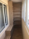 На фото необычная конструкция с угловыми полочками. Небольшая лоджия выглядит шире, а шкаф не загромождает пространство.