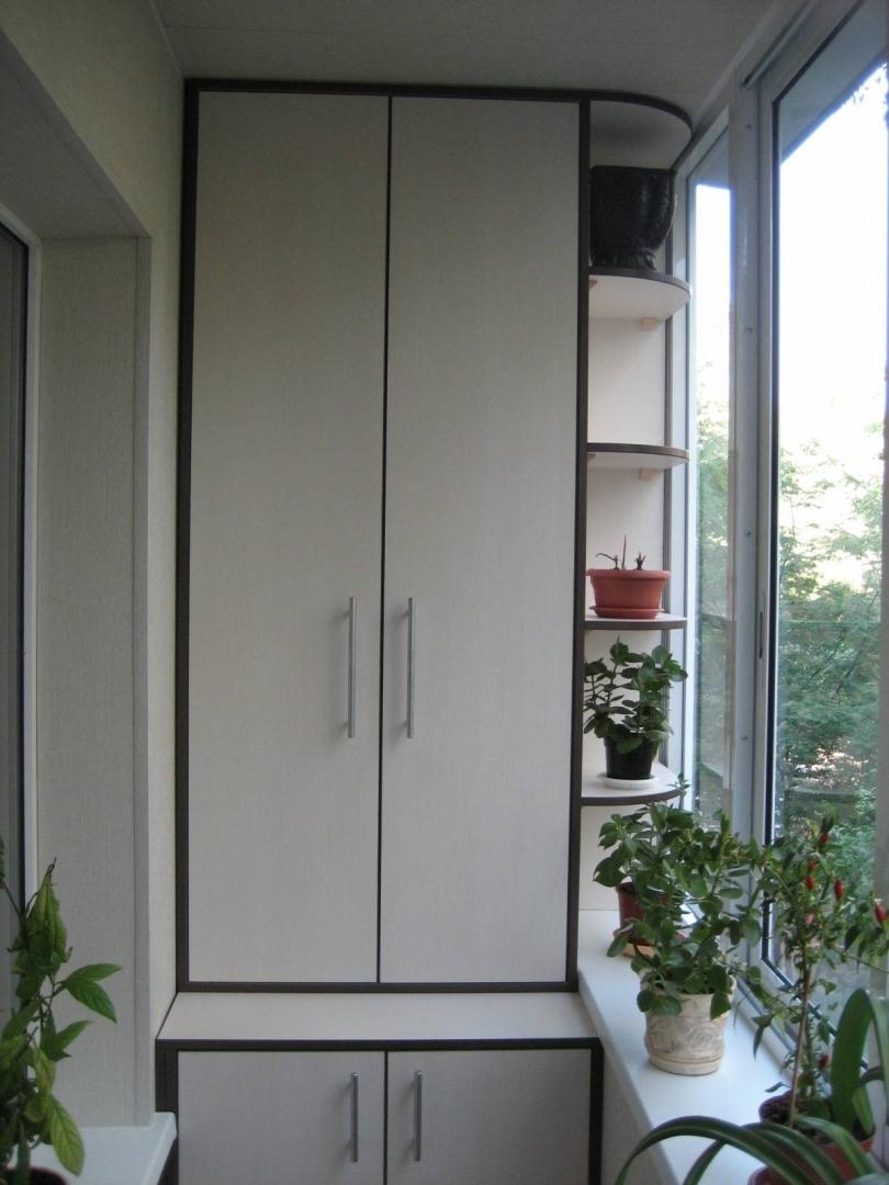 - Рассчитайте размер. В первую очередь это будет зависеть от балкона комнаты. Прямой шкаф можно ставить с торца, при этом он не должен мешать подоконнику, отопительным приборам, трубам и т. Д.D. Окно лучше не загораживать или делать это с минимальной потерей естественного света. Обычно используется все пространство до потолка. Глубина зависит от пункта назначения. Для рыболовных снастей или инструментов достаточно 35 см. Для заготовок или хранения бытовой техники — по возможности 50-60 см. Угловой шкаф считается более компактным вариантом, скос можно направить так, чтобы не касаться окна или сделать более комфортным проход.