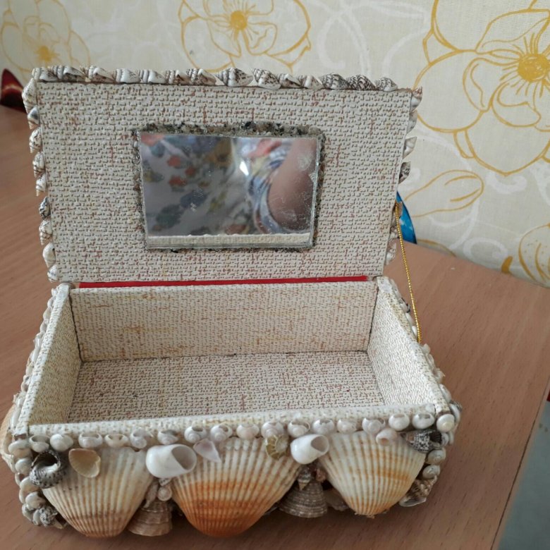 Такая оригинальная поделка, но при этом справится даже ребенок. В качестве основания можно взять простую старую шкатулку, картонную коробку, или просто собрать все из плотного картона. Для красоты оклей внутреннюю часть тканью, вроде бархата. А уже сверху выкладывай ракушки на клей. Рекомендуем сначала потренироваться с выкладкой, чтобы выбрать удачную композицию, и в процессе все красиво сошлось по размерам.