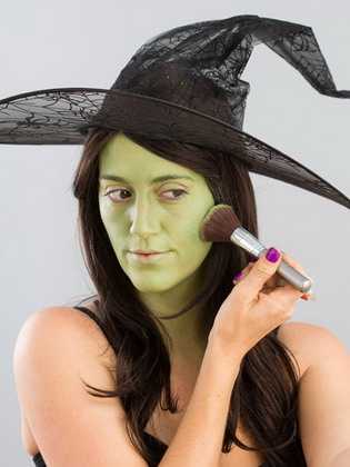 Для создания реалистичного облика ведьмы важно придать коже бледности. Чтобы добиться такого эффекта, на кожу нужно нанести светлую пудру, тональный крем, подойдет и детская присыпка.