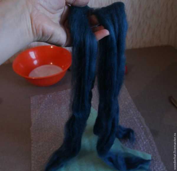 Первый ряд прядок кладем «диффузным» краем вверх. Это значит та часть прядки, которая у вас в руке кладется ближе к нижнему краю шаблона. Так поля шляпки не будут сильно растягиваться во время валяния. Следующие вертикальные ряды кладем, как нам удобно. Не забываем класть вертикатьные ряды прядок внахлест (верхние прядки закрывают нижние на половину).