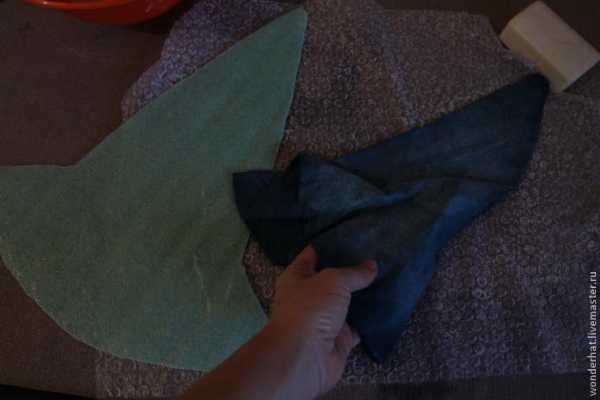 Дальше можно валять, притирая руками или катать на трубе (скалке). Катать нужно в разных направлениях. Сначала накручивать шляпку на скалку вертикально, потом горизонтально. Периодически я выворачиваю шляпку , перекладываю так, чтобы не образовывалось швов и заломов. Лишнюю воду с рабочего места собираю полотенцем.