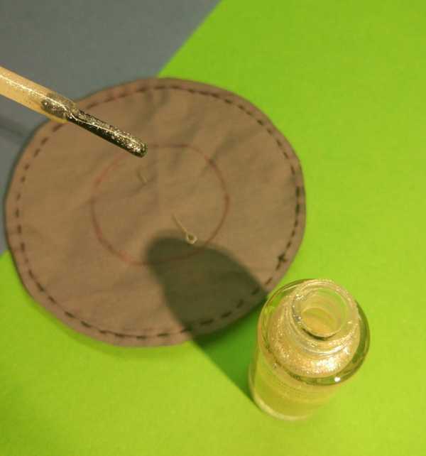 Для основания шляпы вырезаем круг из фетра диаметром 8 см и обшиваем его края петельным швом с помощью черных ниток. Строго по центру приклеиваем конус с петелькой с помощью клеевого пистолета. Стараемся не допускать попадания лишнего клея на заготовки, убрать его с фетра будет затруднительно. Основание конуса закрываем шелковой ленточкой, украшаем ее пряжкой из фетра фиолетового или любого другого цвета.