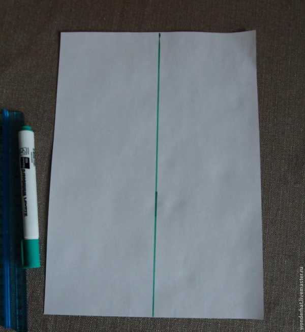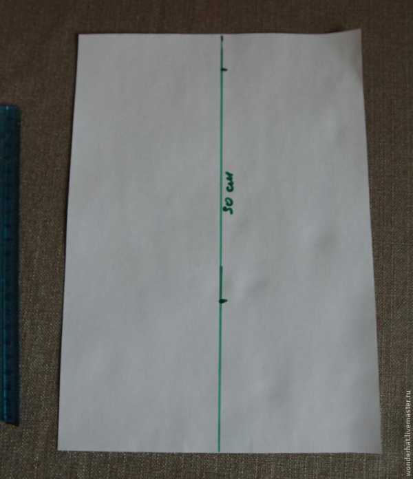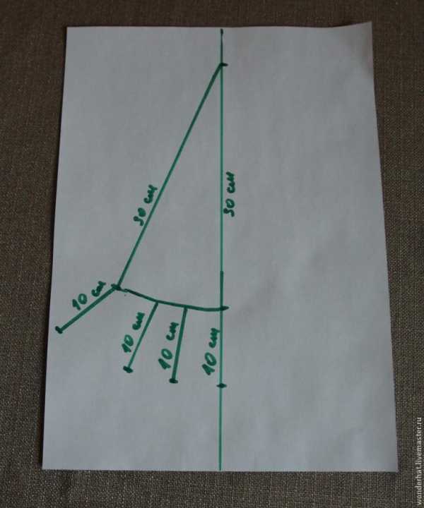 Делим лист пополам прямой линией. Удобнее построить половинку шаблона, а затем вырезать симметрично. Откладываем отрезок 30 см (по факту берем в два раза меньше, чтобы рисунок поместился на листе (т.е.15 см). Это середина шаблона. От верхней точки под углом примерно 40 градусов откладываем еще один отрезок, такой же по длине, как первый.