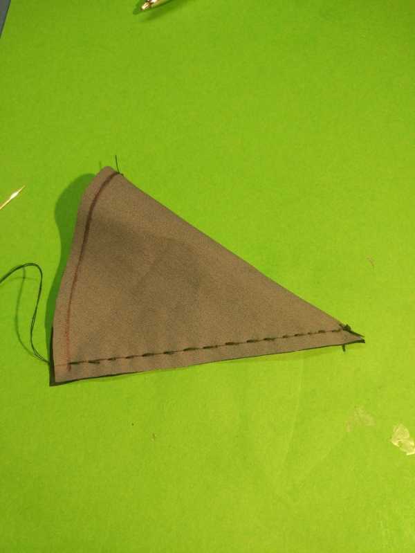 Так как я сделала выкройку конуса сразу на ткани, то переносить с бумаги на ткань мне ничего не нужно. Я беру ранее сделанный мной треугольник и с изнаночной стороны прикрепляю к нему булавки, отступая примерно по сантиметру от края, как показано на фото. Прошиваем шов.