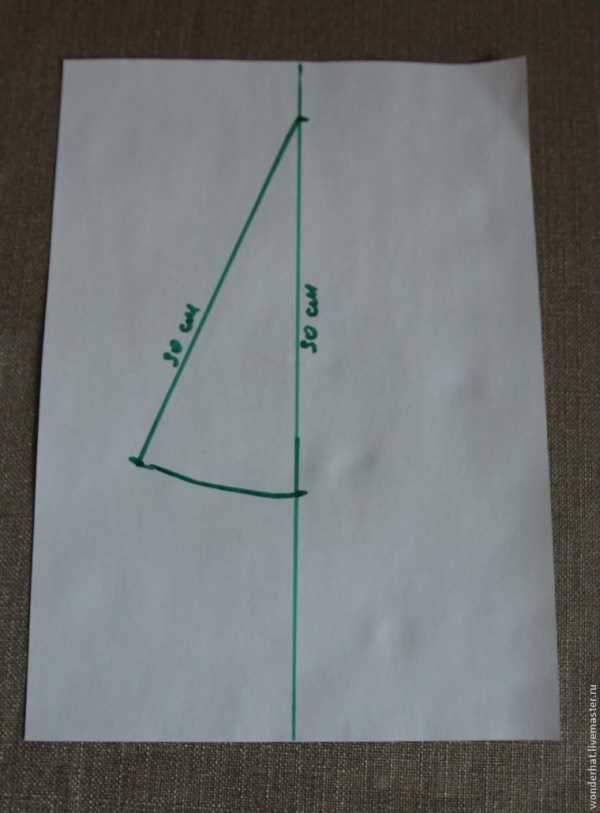 Сейчас нам снова понадобятся измерения, которые мы делали в начале. Мой диаметр головы составляет 53 см + прибавка прим. 2 см = 55 см. Рисуем фигуру похожую на треугольник.