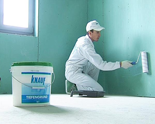 Следующий компонент – грунтование гипсокартона. Для этого тоже существуют специальные смеси. Наносятся они обычным малярным валиком в один слой. Перед нанесением слоя шпатлевки нужно убедиться, что полностью высохла грунтовка, иначе прочного сцепления листа с наносимой отделкой не получится. Также необходимо убедиться, что температура стены и помещения не ниже +5 °С, при более низкой температуре шпатлевка начинает работать плохо.