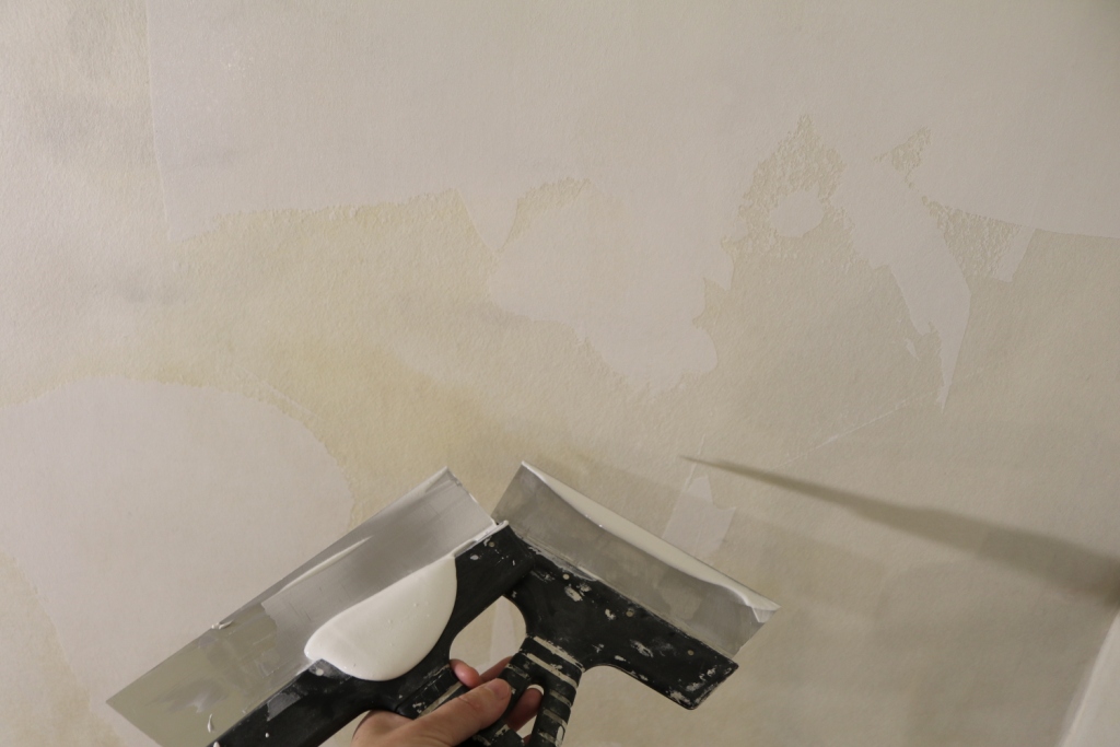 После того, как часть подложки обоев немного отмокнет примерно 12 минут, удалите подложку скребком.