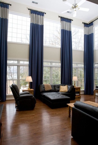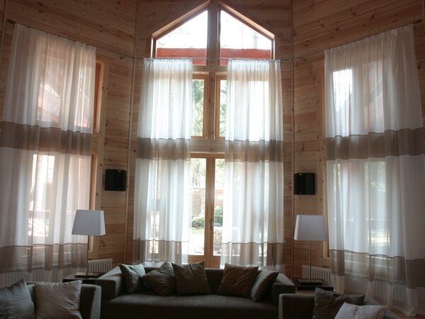 Шторы при двухуровневых окнах могут отсутствовать вообще, либо могут носить декоративную функцию. В холле, где расположен второй свет, окна на верхнем уровне, обычно, не занавешиваются. Они располагаются достаточно высоко, и в вечернее время угол их обзора ограничен.