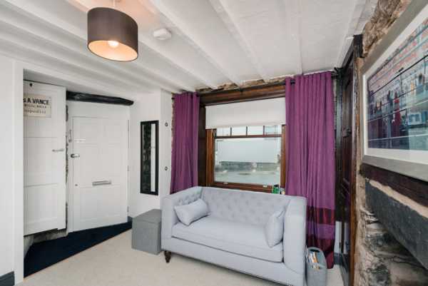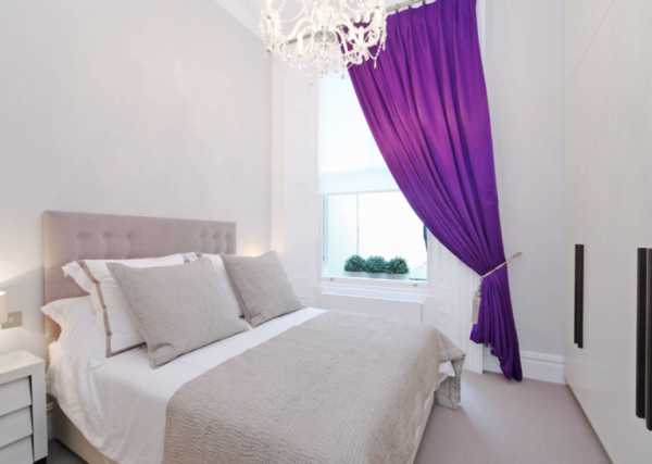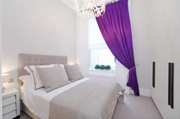 - Прямые портьеры насыщенного фиолетового цвета зрительно вытянут пространство.