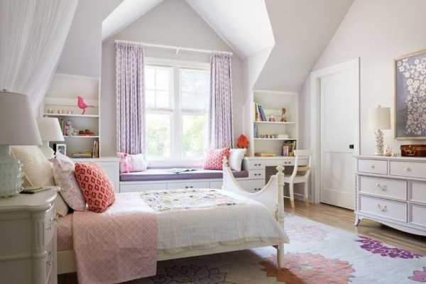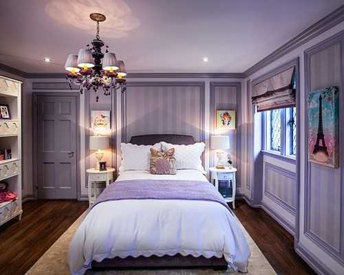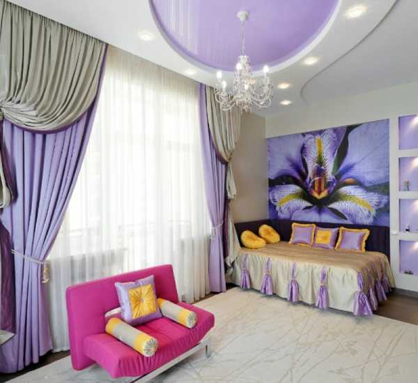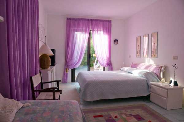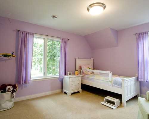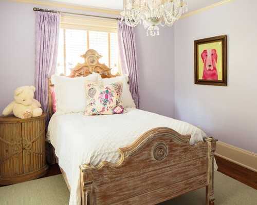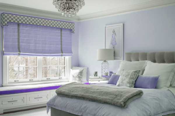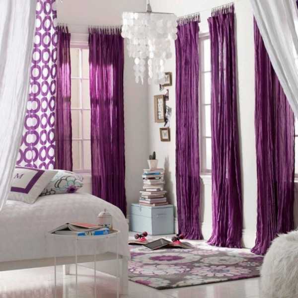 Нередко молодые девушки выбирают шторы в сиреневых тонах, в частности, фиалкового оттенка. Окно декорируется занавесками в один тон, без ламбрекенов. На кровати декоративные подушки, наволочки которых такого же оттенка. Светлыми должны быть остальные поверхности.