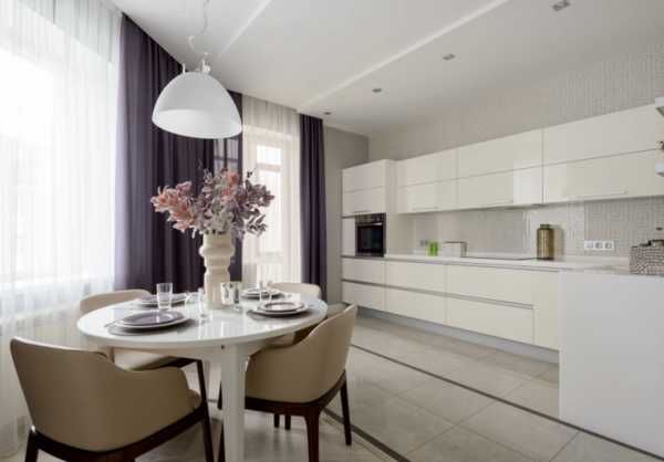 Кухонный гарнитур снежно-белого цвета с глянцем, стены бежевого цвета, и сиреневые шторы до самого пола, что выполнены из кисеи. Есть нечто особенное, завораживающее и даже космическое в таком модном интерьере.