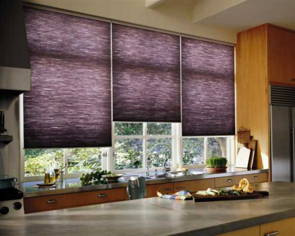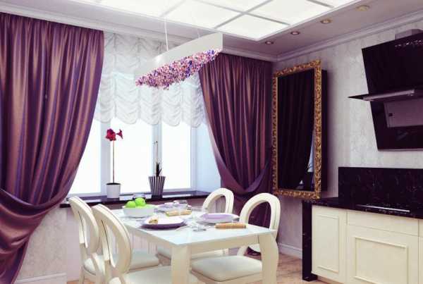 Занавески для кухонного пространства выбираются яркие и радостные, выполненные из натуральных тканей. Для этого помещения подойдет фиолетовый с глубокой насыщенностью.