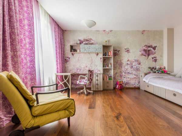 Если комната просторная, то могут быть выбраны глубокие тона. На полу может быть постелен ковер лилового цвета, цветы «одетые» в пастель будут гармонично сочетаться с занавесками яркого цвета.
