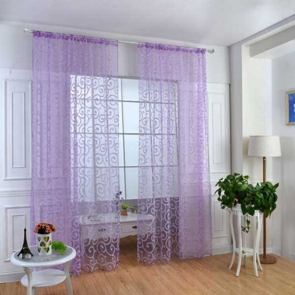 Воздушные тюлевые занавески фиолетового цвета изысканно выглядят в любой комнате. В интерьере можно использовать простую прямую форму или дополнить декоративными аксессуарами, например подхватами. Образовавшиеся складки будут красиво переливаться на свету.