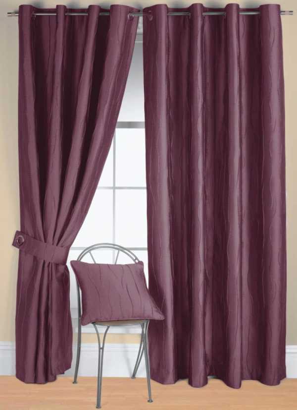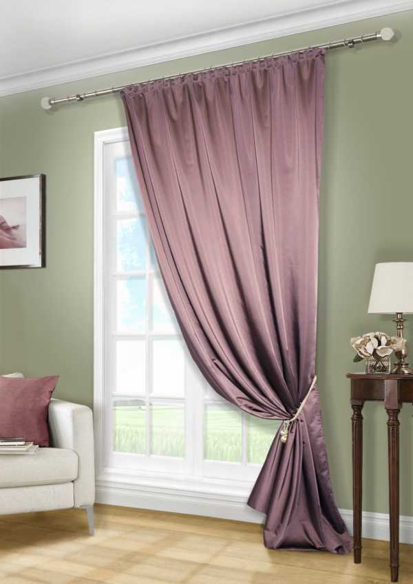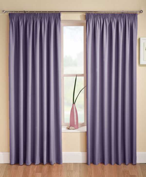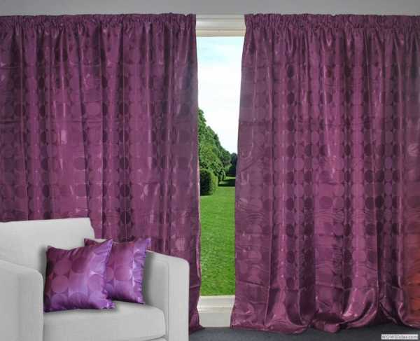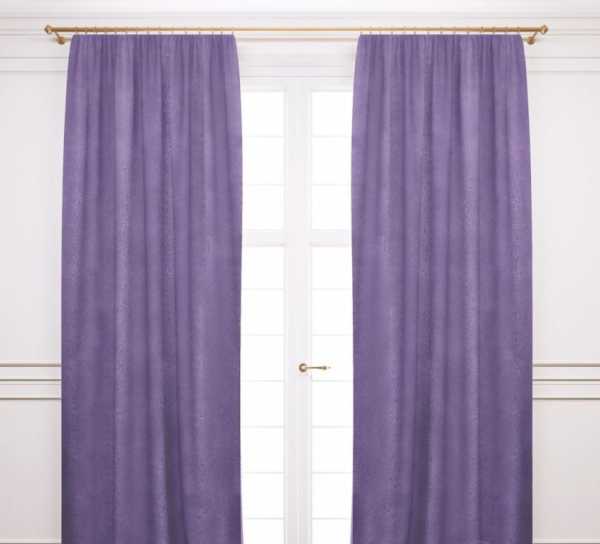 Классические фиолетовые шторы имеют простой прямой крой. Могут отличаться по способу крепления на карниз и декором.