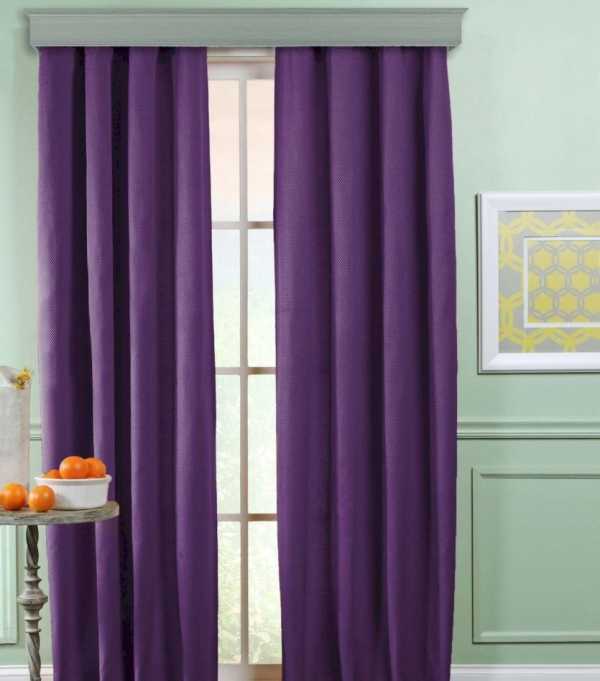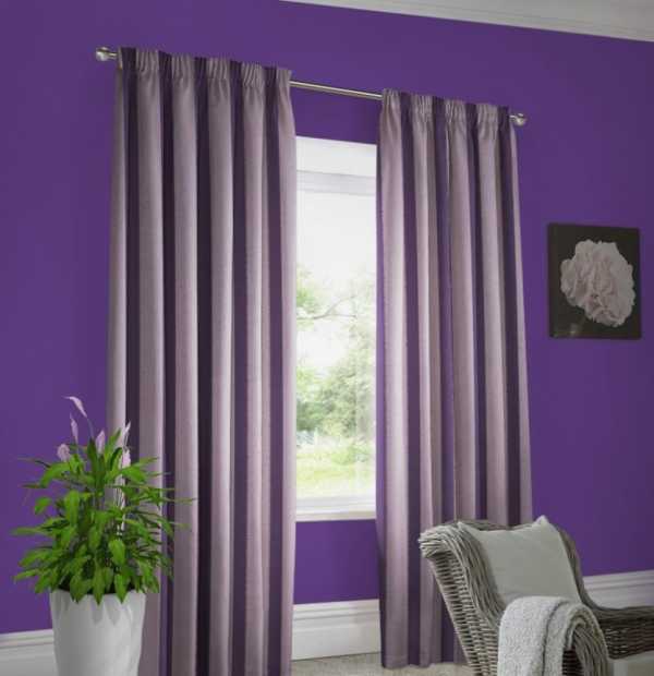 - Подбор оттенка зависит от площади помещения. Светлые обои стильно смотрятся со шторами в темно-фиолетовых тонах, в темном помещении лучше использовать светлые освежающие краски.