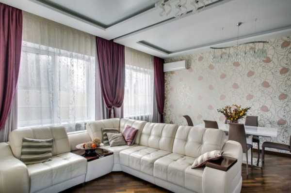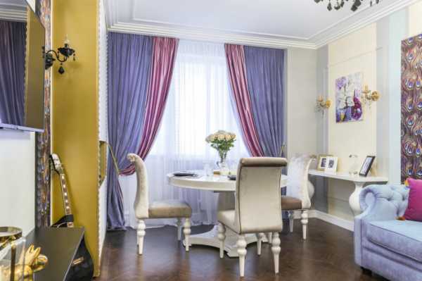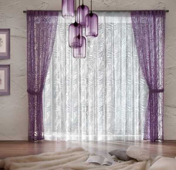 На фото комбинация из портьер и тюля. В интерьере представлен фиолетовый цвет в нескольких оттенках.