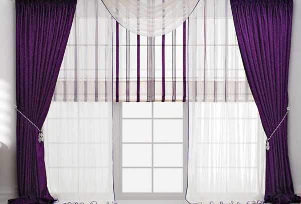 Тюлевая часть может комбинировать с плотными портьерами с рисунком. Рисунок или орнамент поддержит стиль в интерьере. Интересно смотрятся однотонные фиолетовые портьеры в комбинации с плотными шторами с рисунком.