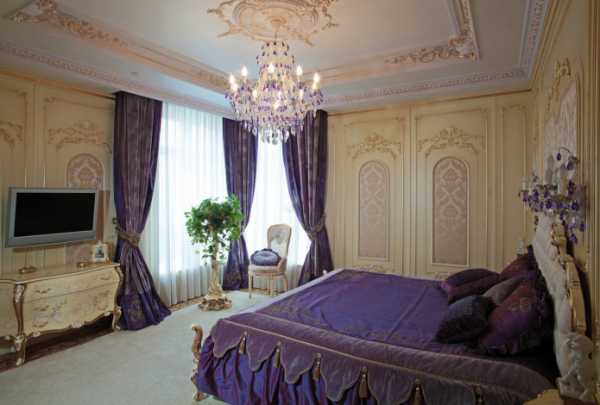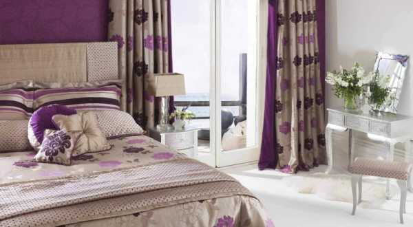 Фиолетовые шторы в спальню лучше подбирать объемные и из плотных материалов, тогда они придадут комнате роскоши.