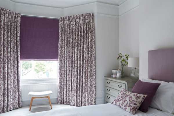 Выбирая дизайн для спальни, специалисты рекомендуют использовать другие элементы интерьера, сочетающиеся с занавесками. Так, подушки и покрывало пусть будут тех же фиолетовых тонов. Контрастная вариация — сочетать лиловый либо лавандовый с сочно желтым тоновым решением. Беспроигрышно будет выглядеть объединение римских штор одного оттенка с портьерами другого.