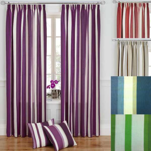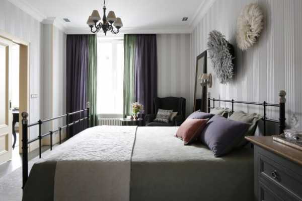 Интерьер спальной комнаты, выполненный в нежных и спокойных тонах, будет дополнен фиолетовыми шторками. Спальная дополняется портьерами, что выполнены из полос разного оттенка одного цвета.