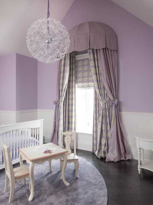 В детскую подойдут легкие хлопковые занавески и тюль оттенка сирени. Шторы с фиолетовыми цветами или геометрическим орнаментом оживят интерьер детского пространства и придадут ему игривое настроение.