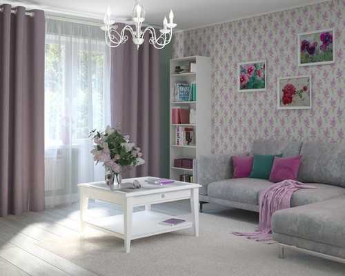 - шторы к сиреневым обоям можно подобрать прохладных оттенков: серого или серебристого, которые помогут скрыться от избытка солнечного света;