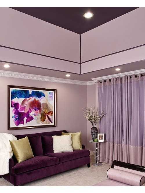 Близкие оттенки дополняют друг друга образуя переливающийся эффект. Фиолетовый скомбинированный с сиреневым подходит для просторных помещений.