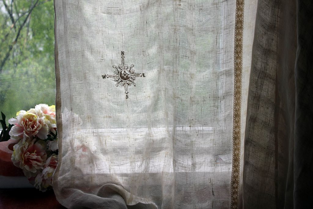 Льняные шторы могут быть с рисунком.Любой домашний текстиль должен сочетаться с общей атмосферой интерьера, с его идеей и стилем. Вот поэтому вид ткани и конструкцию штор следует выбирать исходя из личных предпочтений, из особенностей планировки. Рекомендуется учитывать освещение, ткани и материалы, которые использовались для обстановки, а также назначение комнаты.